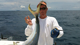 Anglers Jason Laskey and Andrew Lewis from south Florida fished with me last week for three days here out at Propiedad de Paradise Lodge, Isla Paridas. We had planned for three days of venturing out around Hannibal Bank and Isla Montuosa in search of the YFTs that have been hanging tough around that area for the past few months. Jose (my mate) and I spent a day catching bait before the guys arrival and managed to fill the livewell moored out in front of lodge with 4 dozen blue-runners. Shortly after the clients arrival one of the outboards starts acting up! Two trips back to Boca Chica to meet the mechanic to figure it out and we still can't get the motor stop it's intermitent sputtering. With our other boat down and awaiting new motors on order I had no choice but to fish the crippled T.O.P. Cat inshore. I couldn't risk running the 40+ miles to the bank with that issue.